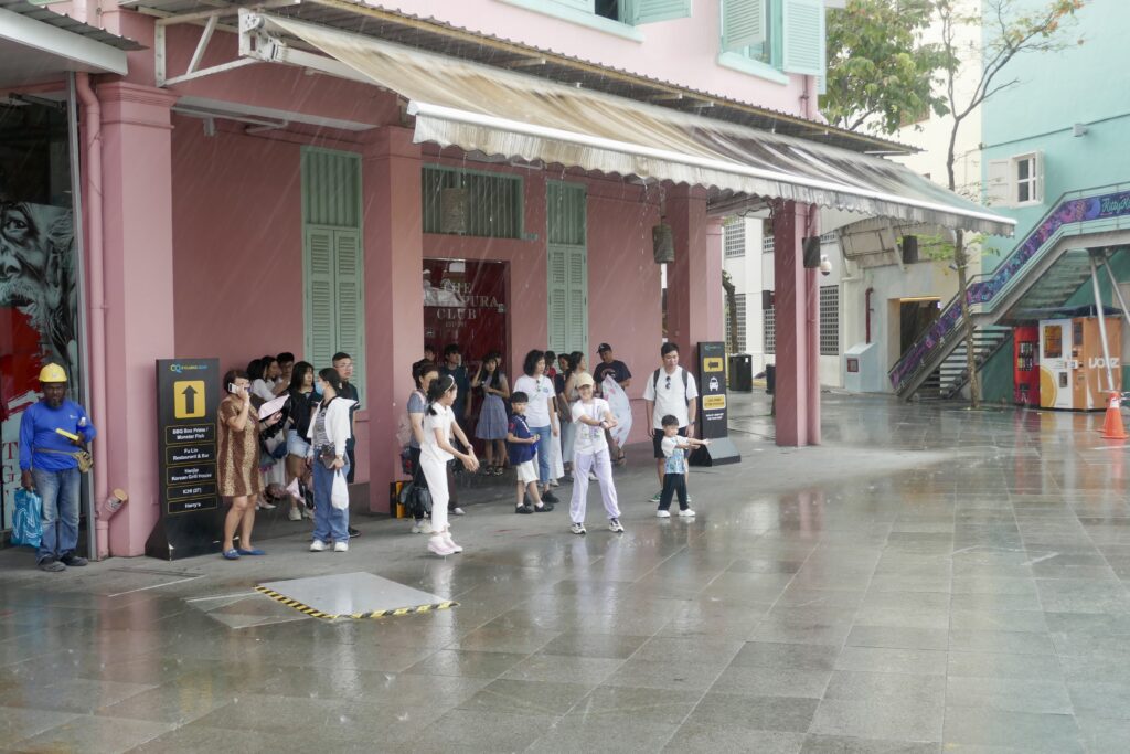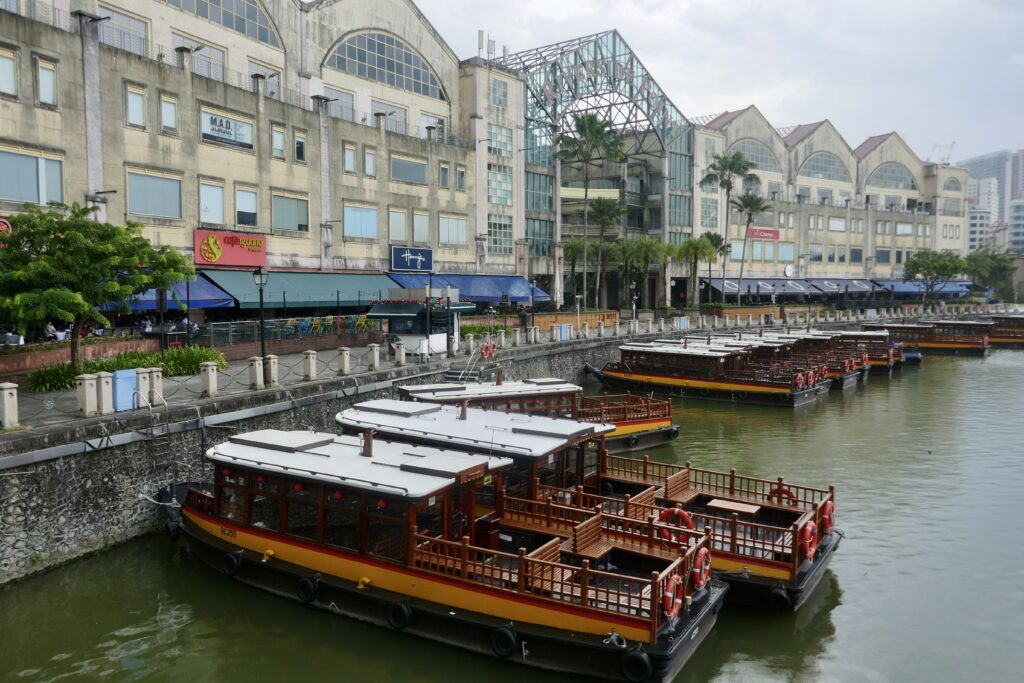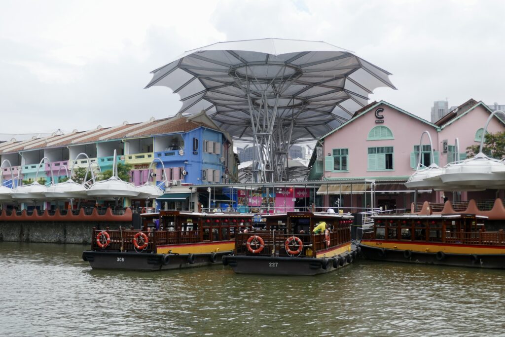Aujourd’hui nous décidons de découvrir Singapour depuis l’eau. Mais à peine le taxi nous a déposées dans le quartier de Clarke Quay où il est possible d’embarquer pour une croisière, voici qu’un orage tropical rafraîchit soudain l’atmosphère. Situé en périphérie du quartier des affaires et de ses buildings, le quartier de Clarke Quay abritait jusqu’en 2006 des entrepôts où étaient stockées les marchandises en provenance du monde entier par voie fluviale.