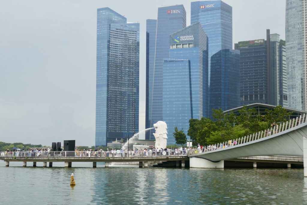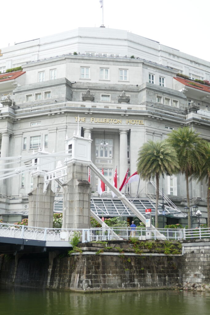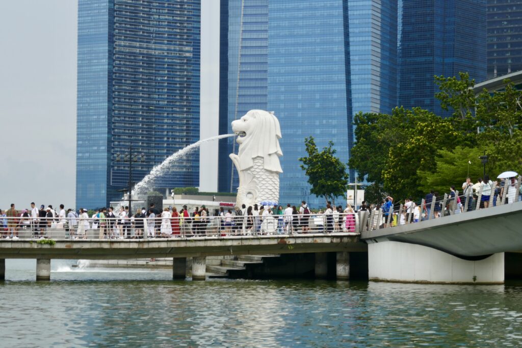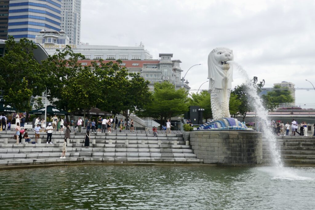 On passe devant le célèbre hôtel Fullerton et, après quelques ponts, on arrive devant le symbole de Singapour, le Merlion, une statue de près de 40 mètres de long représentant un animal avec une tête de lion et un corps de poisson devant laquelle tout le monde veut être photographié. À l’origine, Singapour signifie « la ville du lion », et la présence d’un corps de poisson permet de rappeler que cette ville s’est majoritairement développée autour de l’activité de la pêche.